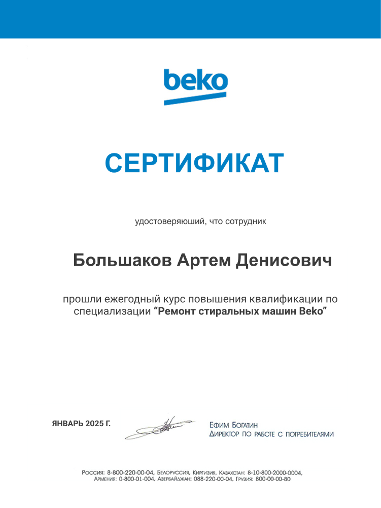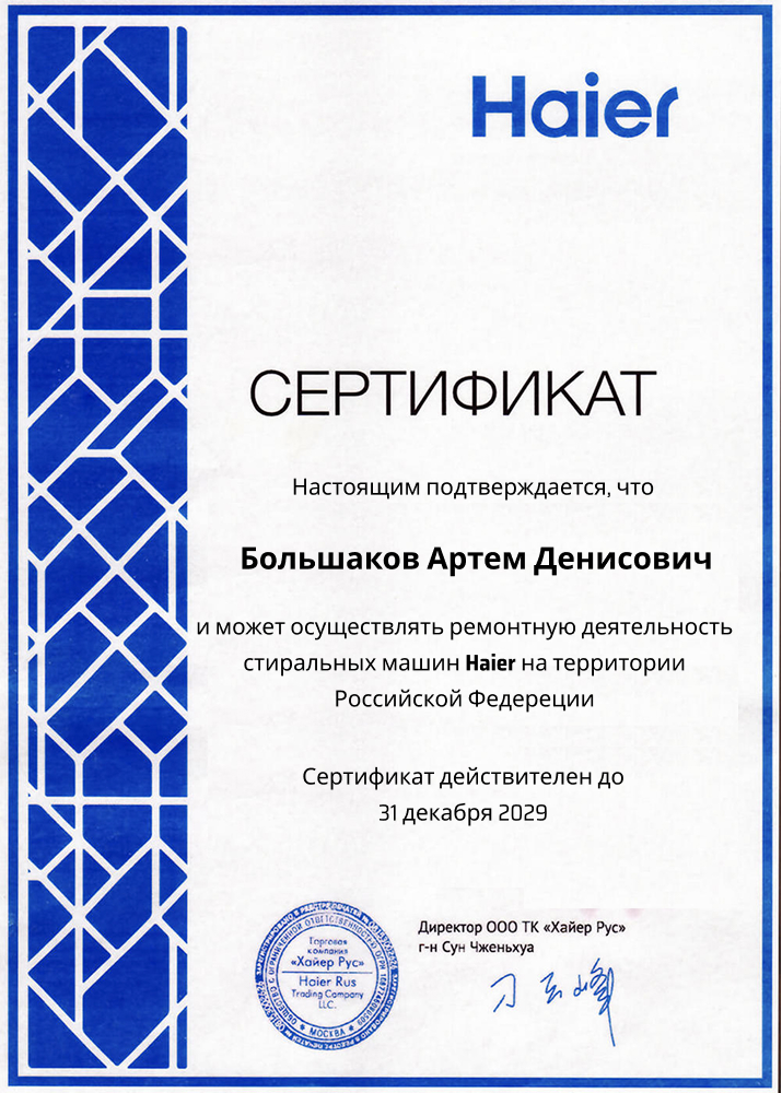 Прошел обучение и повышение квалификации в рамках сервисных программ производителей и учебных центров. Подтверждает навыки диагностики, пайки и восстановления электронных модулей бытовой техники.