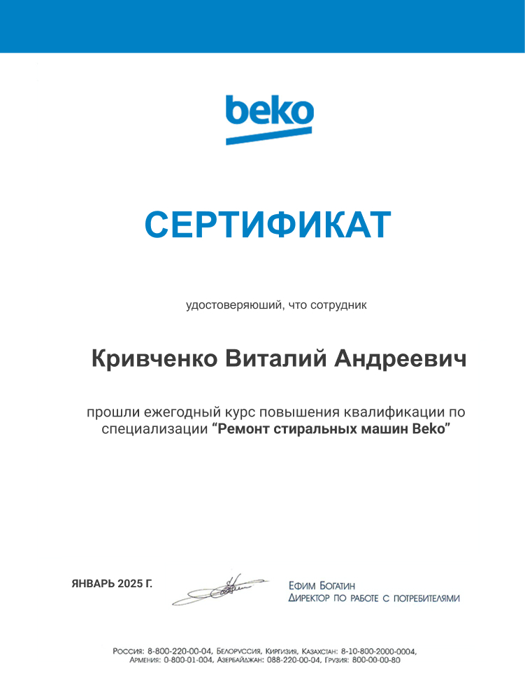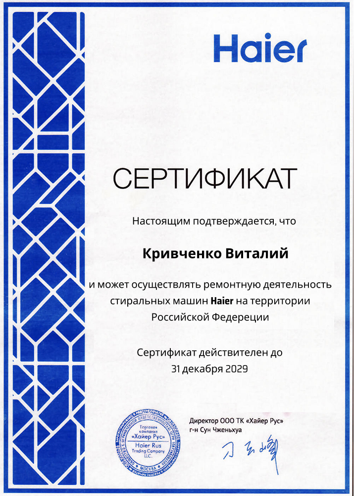Прошел обучение и повышение квалификации в рамках сервисных программ производителей и учебных центров. Подтверждает навыки диагностики и ремонта стиральных машин среднего класса.