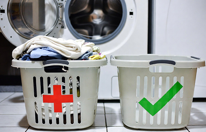 Рядом стоят две корзины — одна с бельём и красным крестом, другая пустая с галочкой, на фоне стиральная машина.
