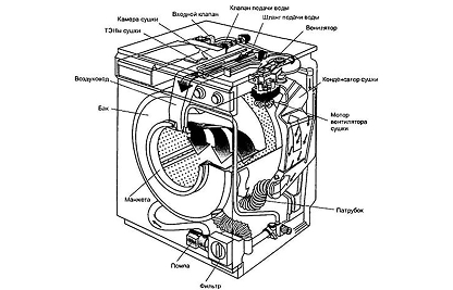 Проверить набор воды, слив, нагрев, шум, вибрацию |