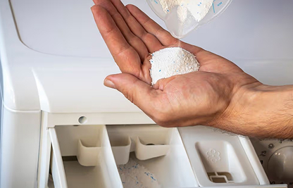 Шаг 3. Убедитесь, что используете качественный и подходящий порошок. Некоторые порошки плохо растворяются в холодной воде или содержат крупные гранулы. Особенно часто это происходит с дешёвыми средствами или подделками известных брендов. В результате порошок слипается в комки, прилипает к стенкам лотка, плохо смывается водой. Проверить это просто — попробуйте провести стирку с другим порошком или жидким гелем.